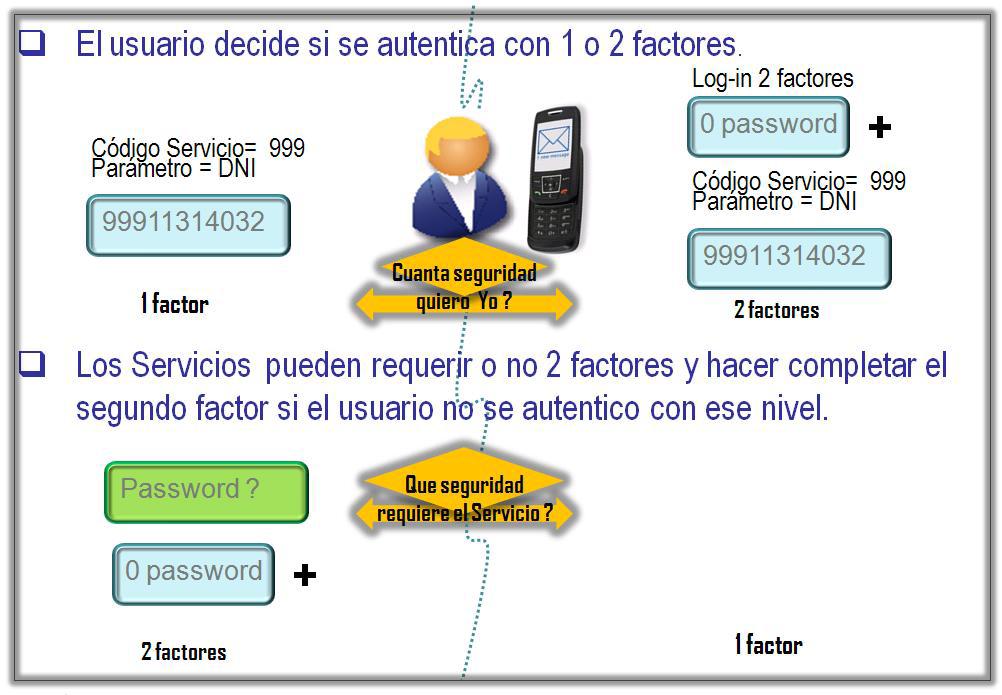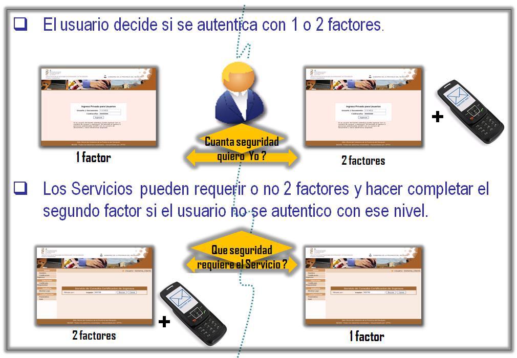 El Autenticador, utilizando los registros de este directorio, proveé servicios de autenticación por 1 o 2 factores. El Primer factor es algo que el usuario debe saber, la ‘Password’, mientras que el segundo factor es algo que el usuario debe tener al momento de ingresar, como pueden ser un “e-token”, una tarjeta con chip, un teléfono celular. (Ver Anexo: Servicios de Autenticación – LDAP)