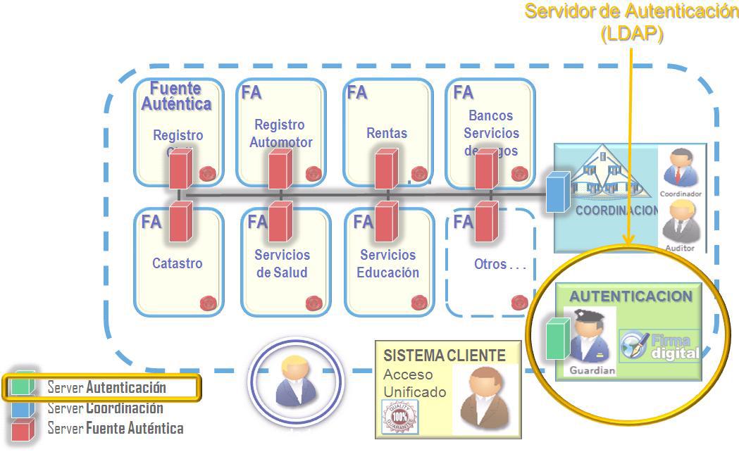Tecnológicamente: el Autenticador se materializa mediante un software (Server Autenticación) que mantiene en un directorio centralizado la identificación de todos los usuarios, para este fin, el Servidor Autenticador utiliza un Protocolo Ligero de Acceso a Directorios, (LDAP) Lightweight Directory Access Protocol .