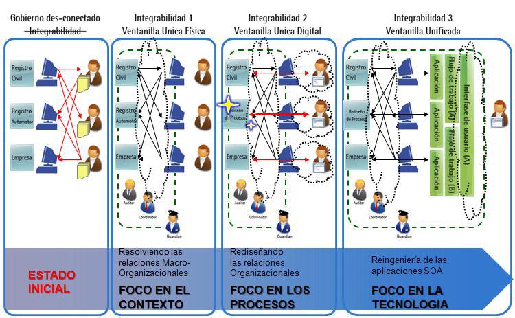 La Iniciativa de INTEGRABILIDAD presenta un abordaje para resolver los múltiples problemas de comunicación que se plantean en los distintos niveles de la complejidad organizacional. Los mencionaremos como fases, etapas o niveles que deben ser cubiertos en el proceso de transformación